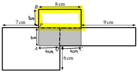 Die grün markierte Strecke beträgt 5 cm, das hast du im vorherigen Schritt berechnet. In der Aufgabenstellung steht, dass der Punkt P in der Mitte von AB liegt.