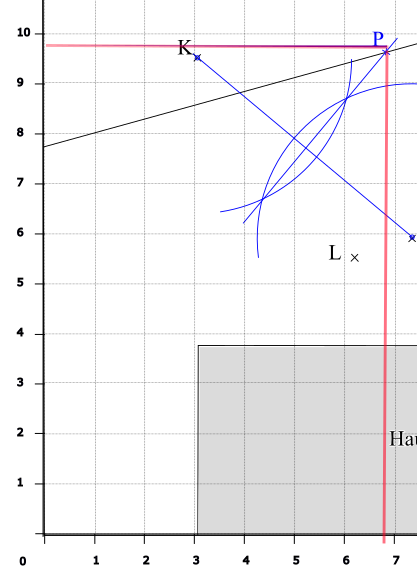 Achtung: Wenn sich Rex links neben dem Haus bewegt, wird seine Leine um die Hausecke geknickt. Berücksichtige das in deiner Konstruktion. Bei welcher Koordinate schneidet das Gebiet, das Rex zugänglich ist, die linke Hauswand?
