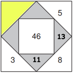Die Zahl 46 ist die Summe der umliegenden grauen Dreiecke (11 + 13 + Zahl 1 + Zahl 2)