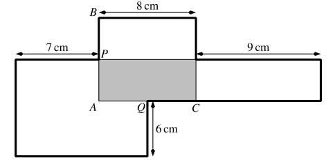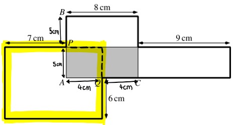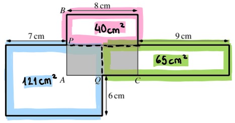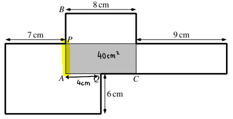 Der Punkt P ist die Mitte von AB und der Punkt Q die Mitte von AC. Der schattierte Teil hat die Fläche 40 cm².