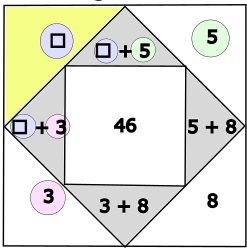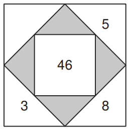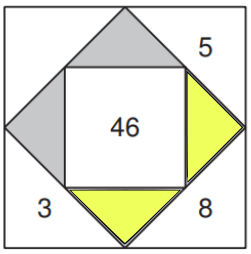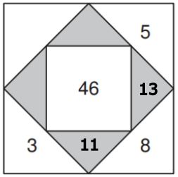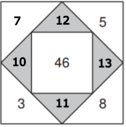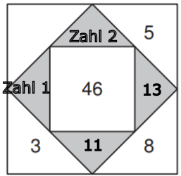 Die Zahl 46 ist die Summe der umliegenden grauen Dreiecke (11 + 13 + Zahl 1 + Zahl 2)