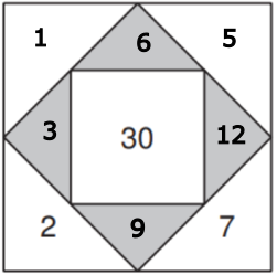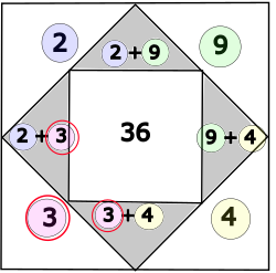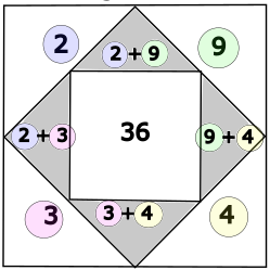 in der Mitte ist die Summe der vier Zahlen in den grauen Dreiecken.
