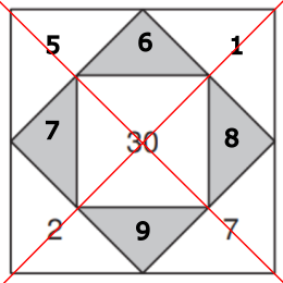 Summe der äussersten Dreiecke 30 : 2 = 15