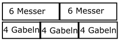 Der Wirt hat dann 12 Gabeln und 12 Messer, also drei Gabelnschachteln und zwei Messerschachteln.