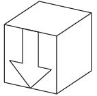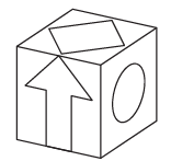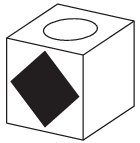 Der untenstehende Würfel wird gedreht und/oder gekippt. Auf der einen Seite sind die drei sichtbaren Symbole weiss wie abgebildet, auf der gegenüberliegenden Seite ist dasselbe Symbol schwarz.